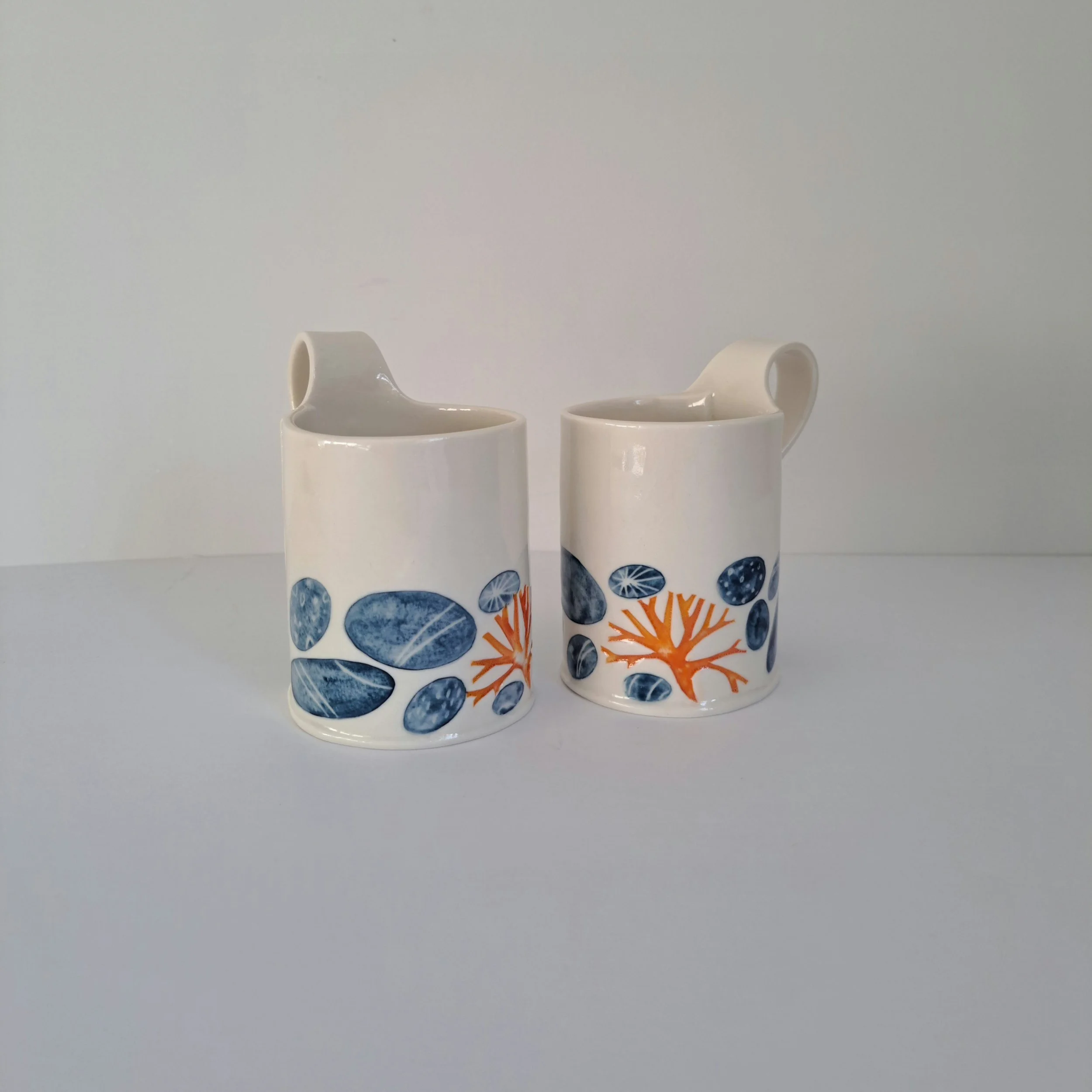 ‘Beach comber’ pattern mugs with blue & orrange underglaze decoration inspired by pebbled beaches.