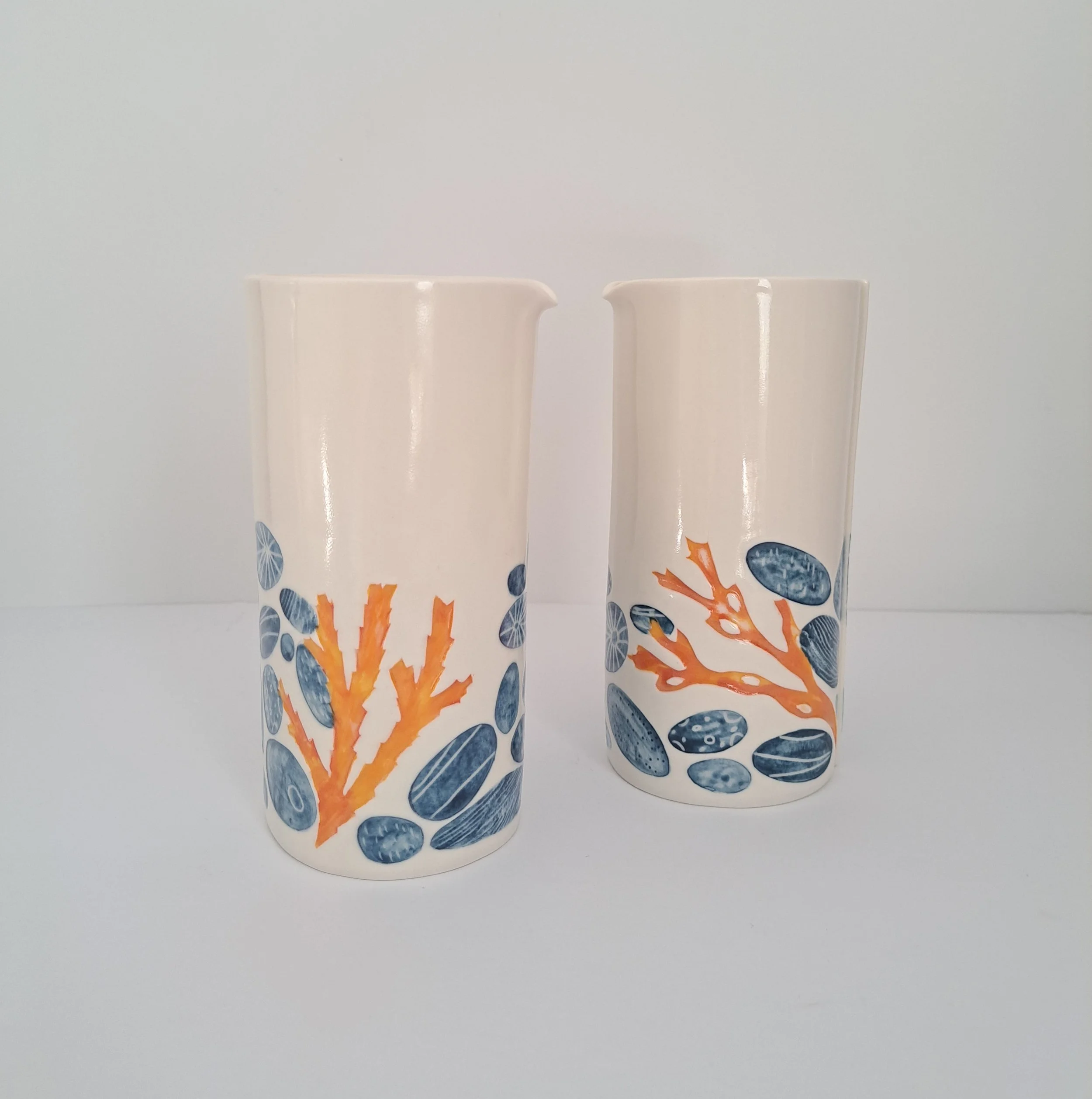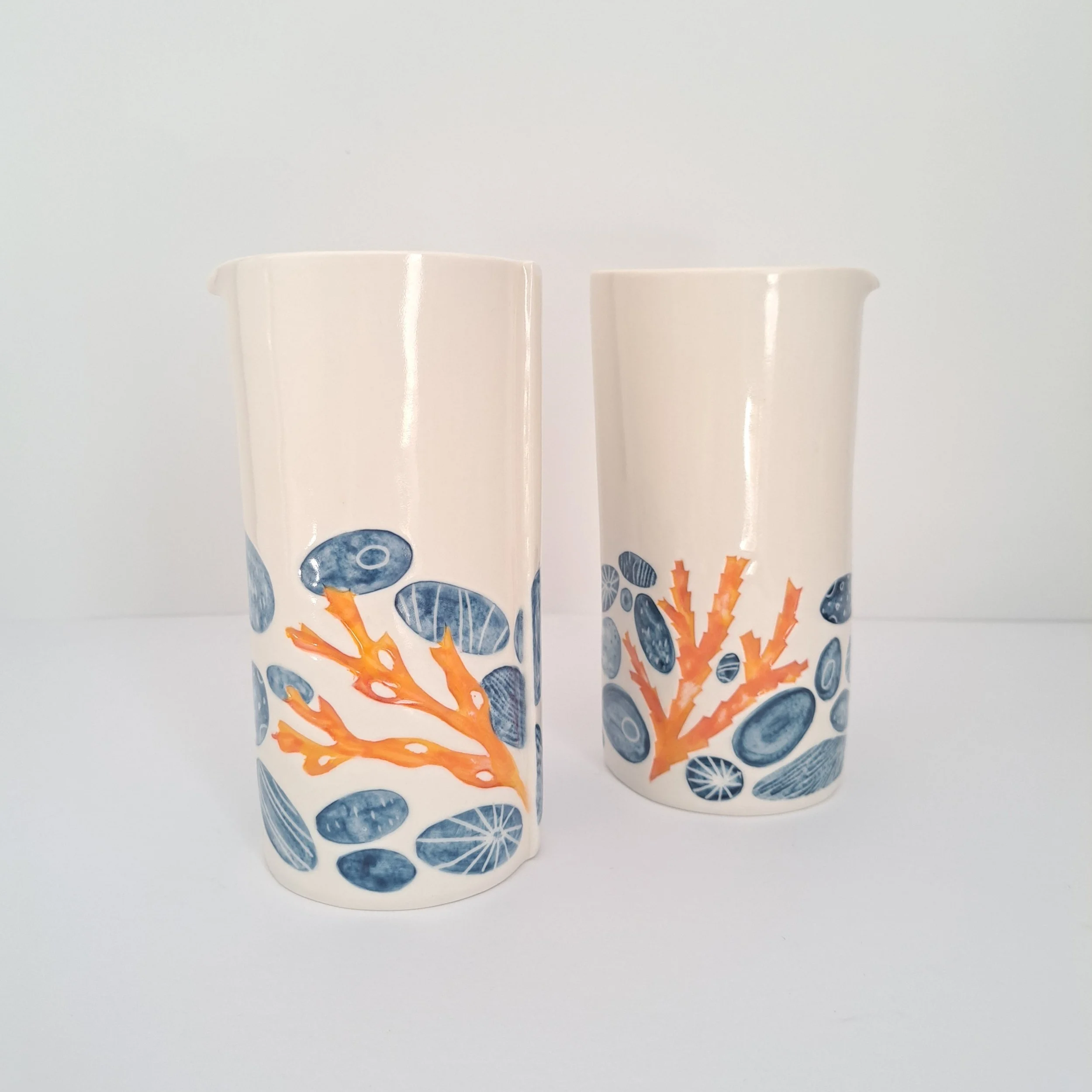 Large handbuilt porcelain pourers/jugs with underglaze decoration inspired by a pebbled beach.