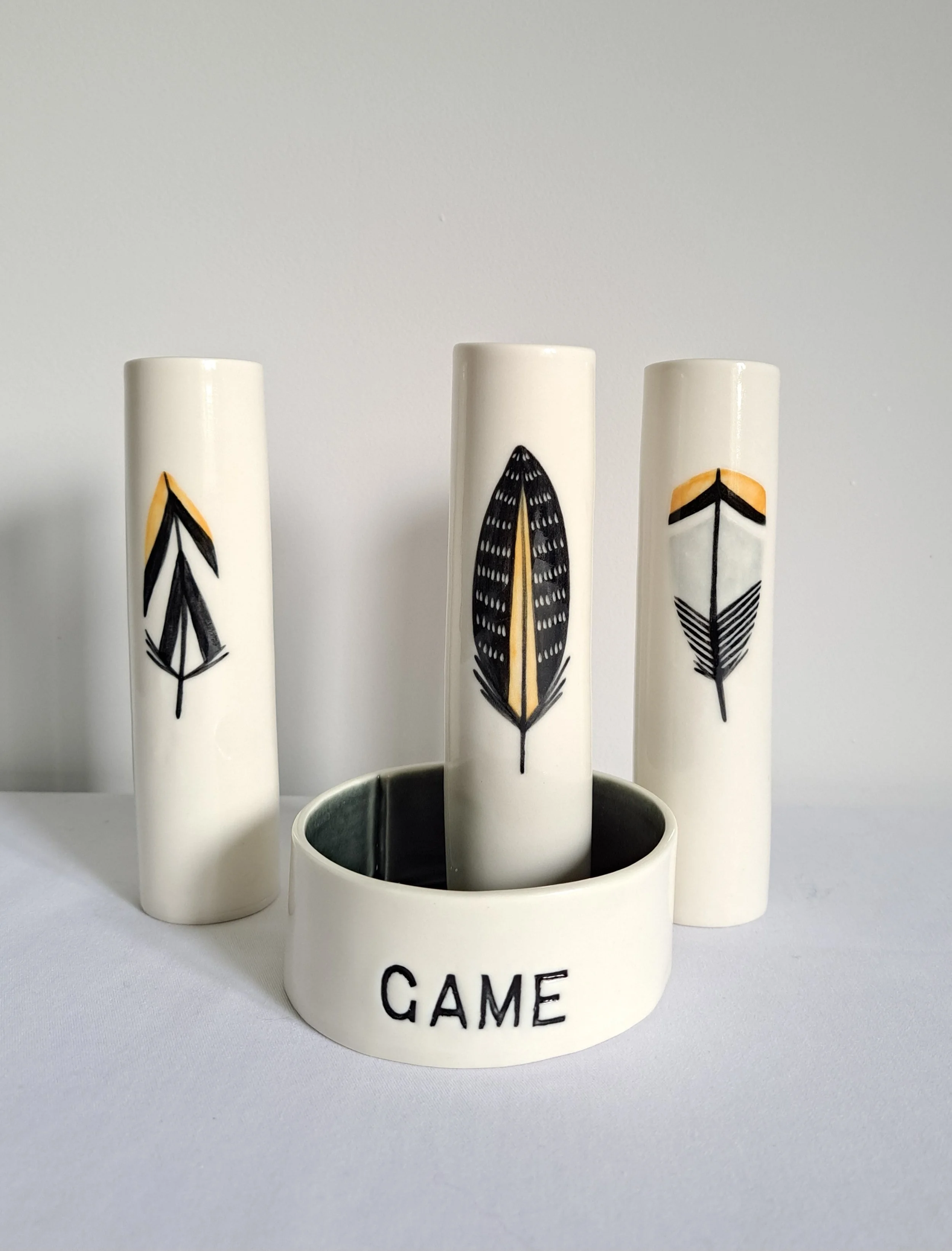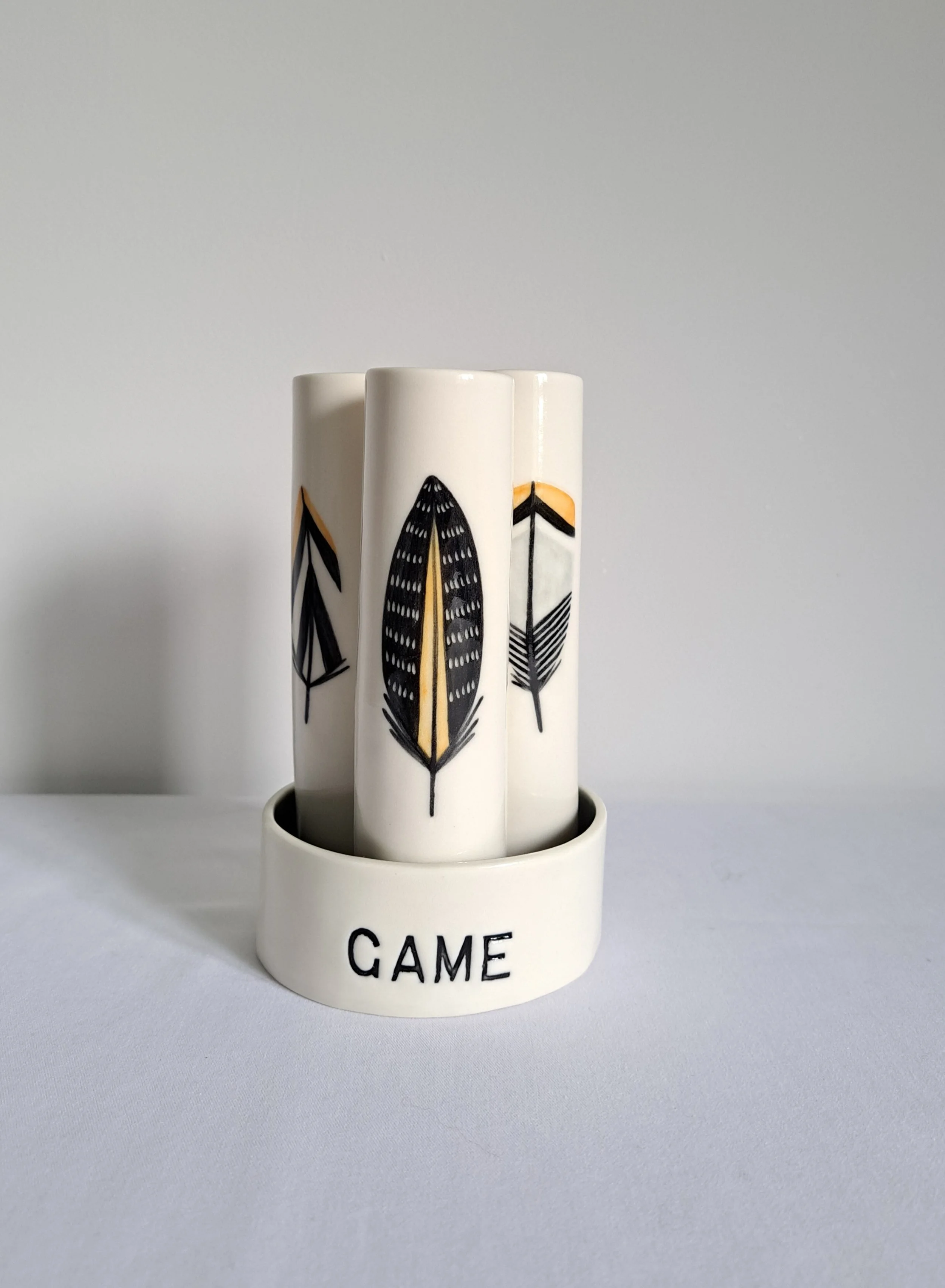 This is a set of four vessels with handpainted feathers inspired by ‘Game Bird’ species. It includes a partridge, grouse & pheasant feather on 3 of the vessels which sit together in a larger vessel to hold/display them as a set.