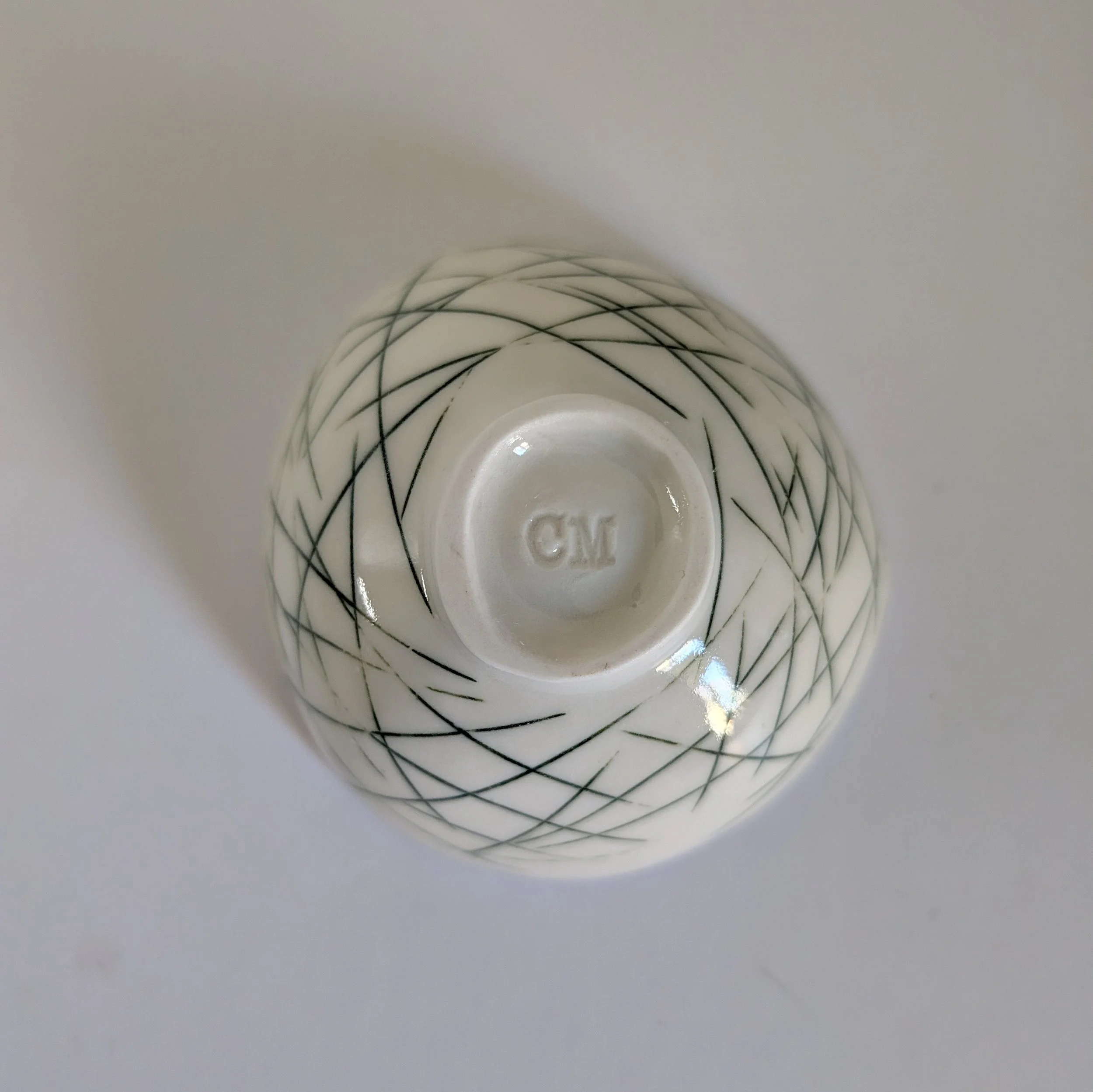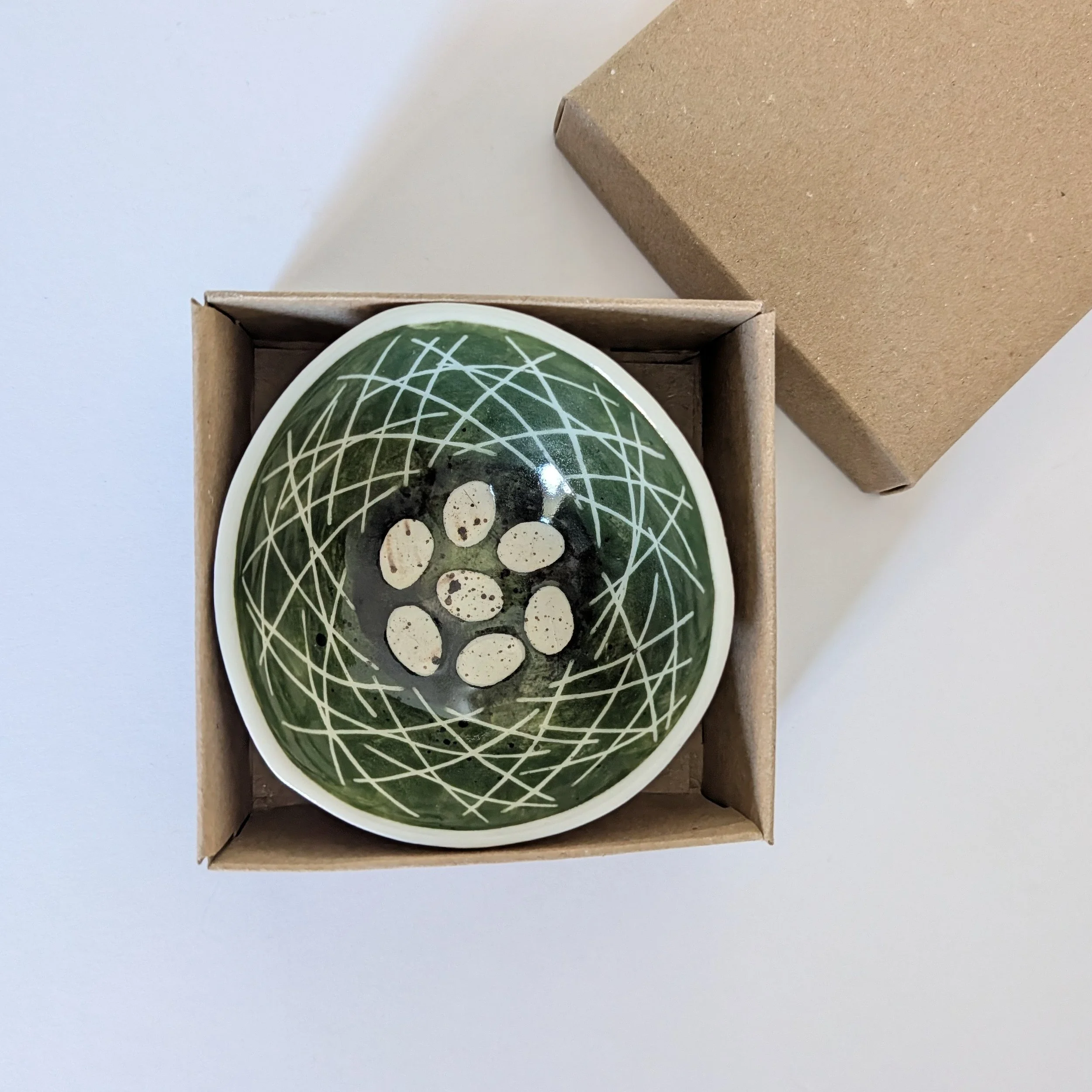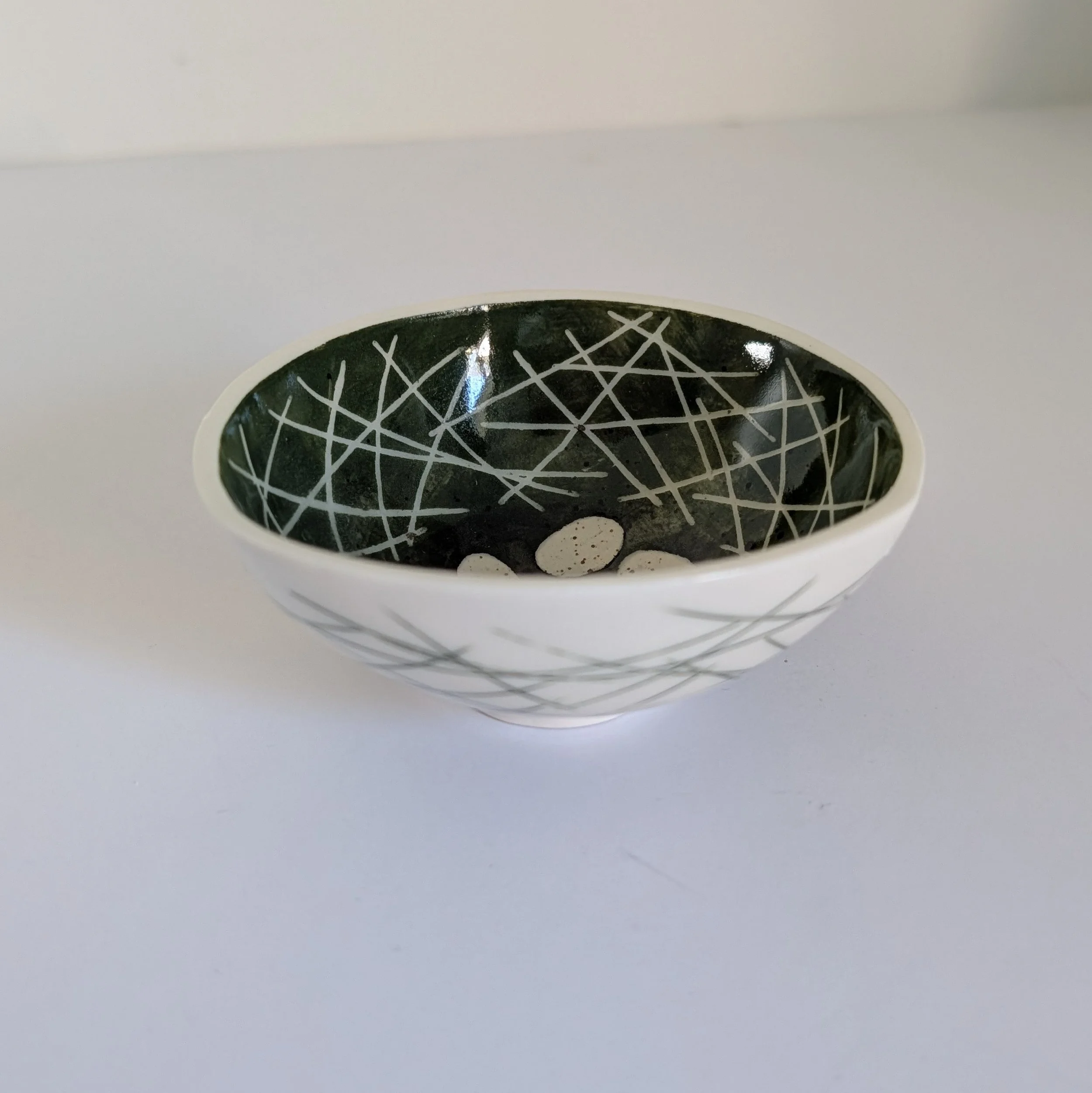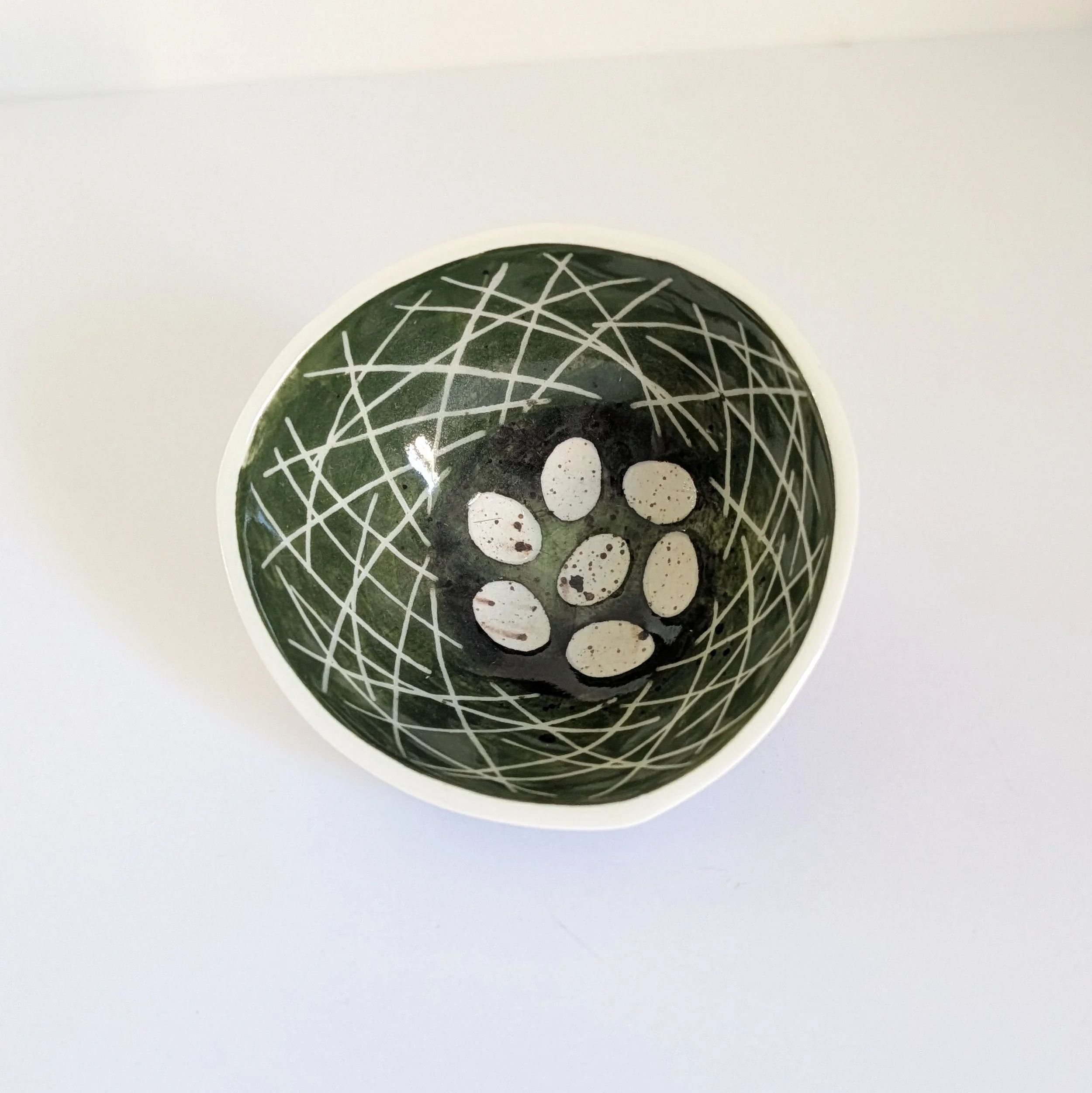 This individual handbuilt porcelain bowl has scraffito decoration inspired by a bird nest. This particular design is inspired by ‘Wren’ nests. This piece is glazed all over but the eggs left matt (no glaze). The bowl comes boxed - see pic 4.